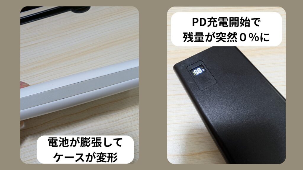 今回モバイルバッテリーを新たに購入した理由はリチウムイオンバッテリーの膨張が原因です。